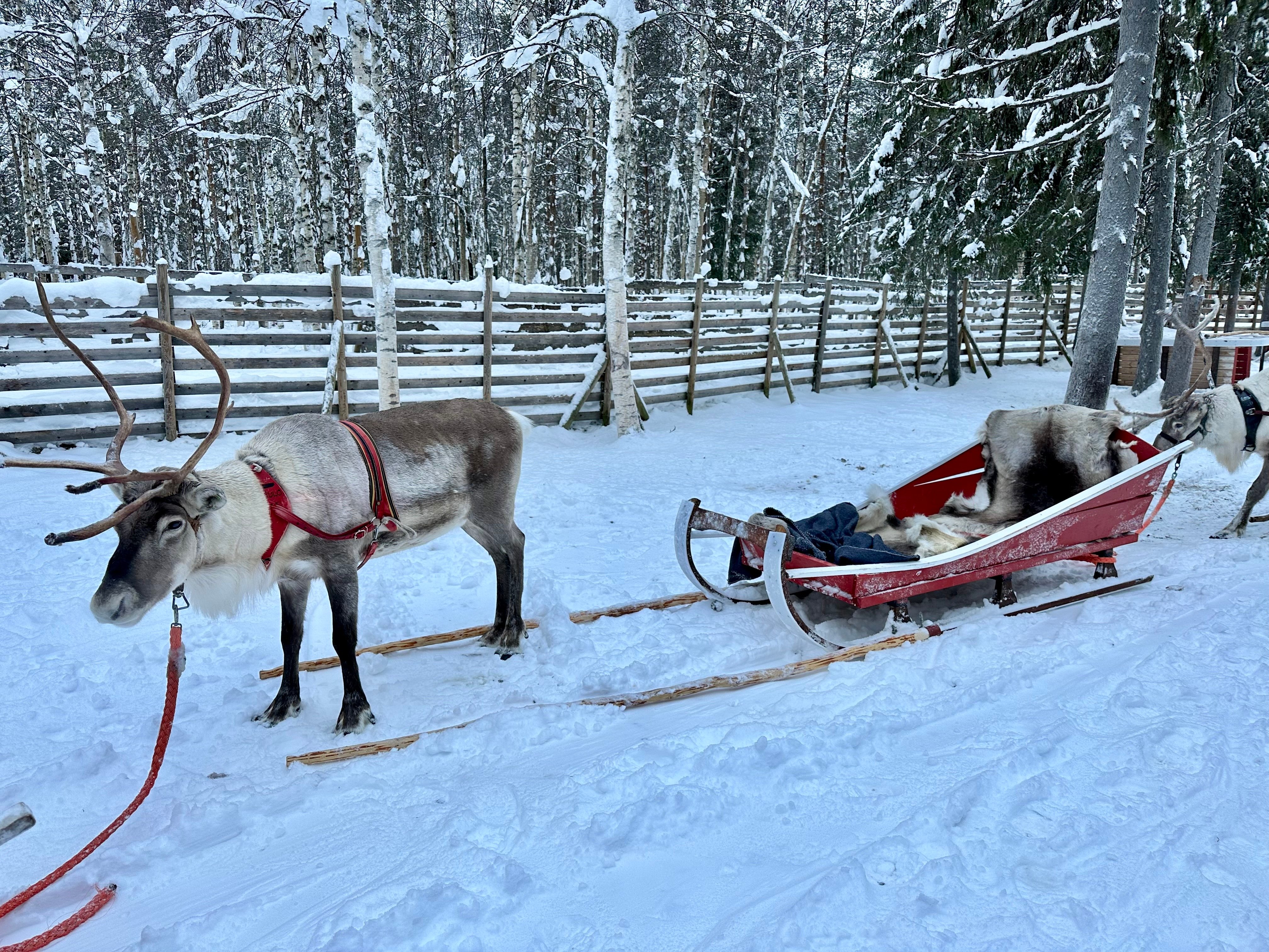 We decided to drive a bit outside the city on this day to visit a reindeer and husky farm, and I felt this was the best part of our trip! In the morning, we took a reindeer-pulled sleigh ride through a frozen Lappish forest, enjoyed a warm berry drink and a snack in a Kota hut, and then went on a husky-pulled sled ride!